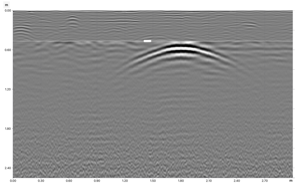 El método de GPR (por sus siglas en inglés) es una técnica novedosa que permite el estudio del subsuelo mediante la emisión y recepción de ondas electromagnéticas. Es una técnica no invasida ni destructiva y tiene una amplia gama de aplicaciones. Su funcionamiento se basa en la generación de ondas electromagnéticas, a frecuencias que pueden ir desde 50 hasta 2000 MHz, a través de un emisor Tx, dichas ondas viajan al medio, se reflejan y son medidas por un receptor ubicado dentro de la misma antena, generando así un radargrama en tiempo real. En su viaje las ondas pueden verse alteradas y/o modificadas y se manifiestan en anomalías en forma de hiperbolas. Estas respuestas brindan información sobre la localización de objetos enterrados.
