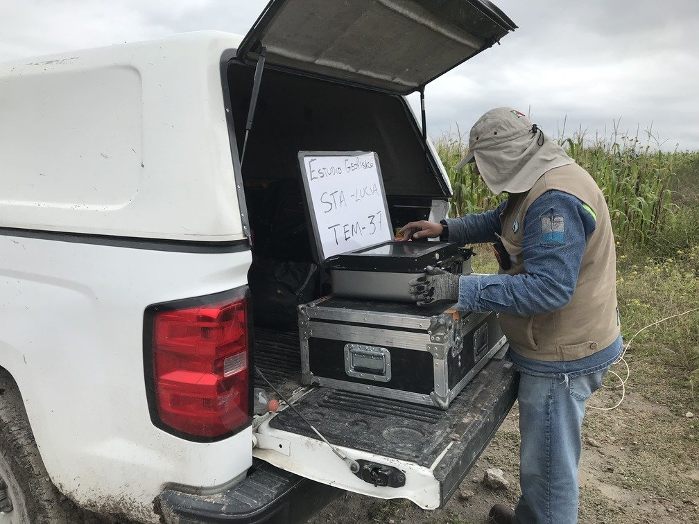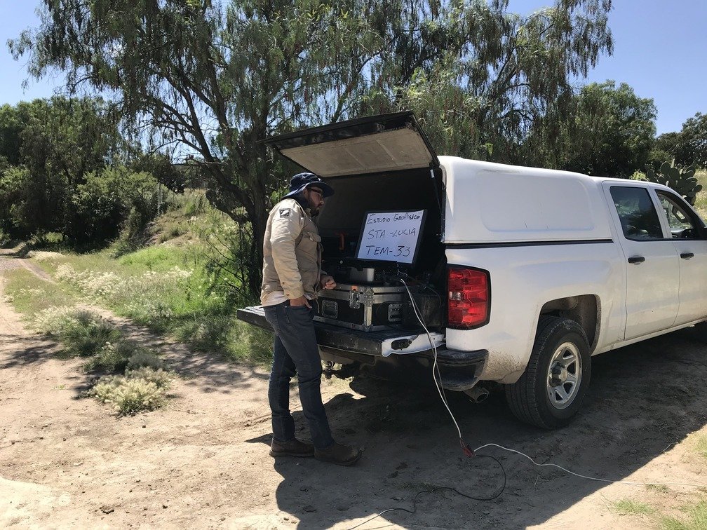 El transitorio electromagnético mejor conocido como TEM, es la técnica más empleada para la determinación de resistividades aparentes a profundidades mayores respecto al método de SEV. La técnica consiste en generar una corriente a través de una bobina transmisora (Tx), la cual genera un campo magnético primario. Al cortar la corriente de manera repentina se interrumpe el campo magnético primario y se generan corrientes que se disipan al subsuelo de manera horizontal y vertical. Estas corrientes migran a profundidad y decaen en función del tiempo, generando un campo magnético secundario y voltajes que son leídos por una bobina receptora colocada en superficie (Rx). Los voltajes leídos contienen información sobre la resistividad del subsuelo ya que la magnitud y distribución de estas corrientes inducidas dependen de la resistividad del medio.